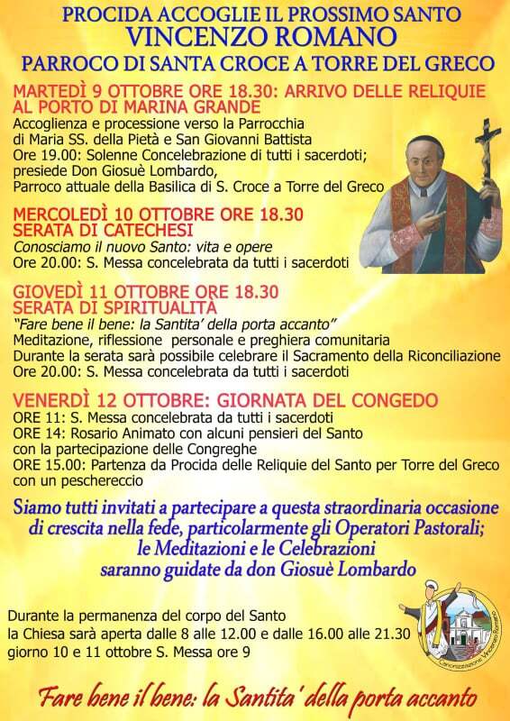 PROCIDA – Le comunità di Procida e di Torre del Greco si stringono intorno al corpo del Beato Vincenzo Romano che arriverà sull’isola il prossimo 9 Ottobre. L’attuale parroco di Torre del Greco, Don Giosuè Lombardo e il clero di Procida, infatti, di comune accordo, hanno pensato di portare il corpo del Beato Vincenzo Romano a Procida proprio nella Parrocchia dei Marinai, guidata da Don Giovanni Costagliola che si avvale di una attivissima collaboratrice quale Carmen Cibelli, e dedicata a Maria SS. della Pietà e S. Giovanni Battista proprio per il legame che  unisce “gli uomini di mare” i Torresi e i Procidani per la vita di mare ed in modo particolare con la Chiesa dei Marinai e il Pio Monte, antico e prezioso sodalizio presente sia a Torre del Greco che a Procida da oltre 400 anni.