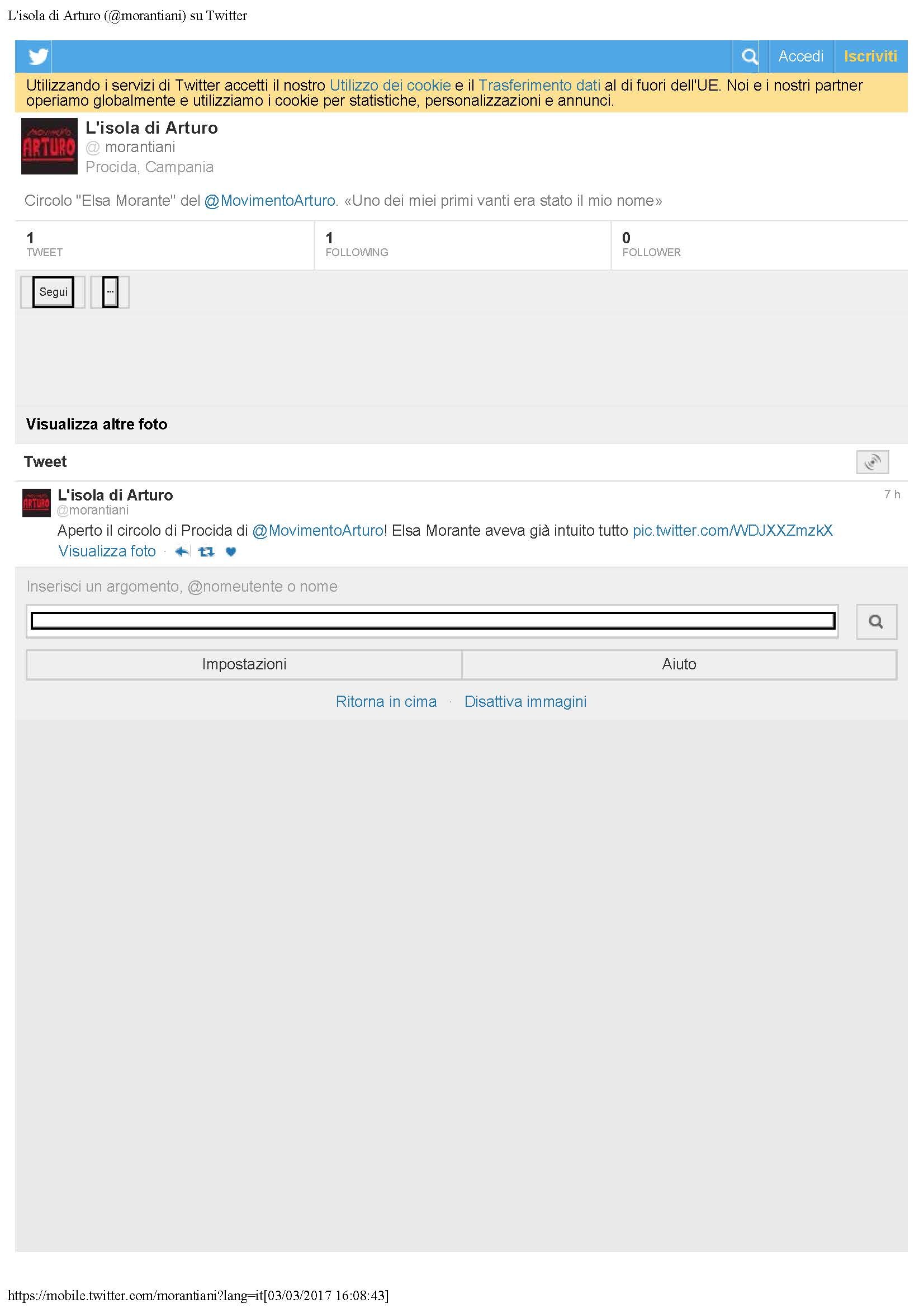Ed anche Procida, isola di Arturo per definizione morantiana, ha la sua pagina Twitter “l’isola di Arturo”@morantiani. Nel primo twitter si legge: “Aperto il circolo di Procida di @MovimentoArturo! Elsa Morante aveva già intuito tutto”.