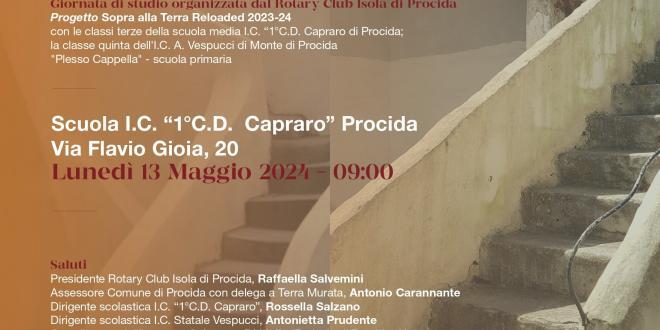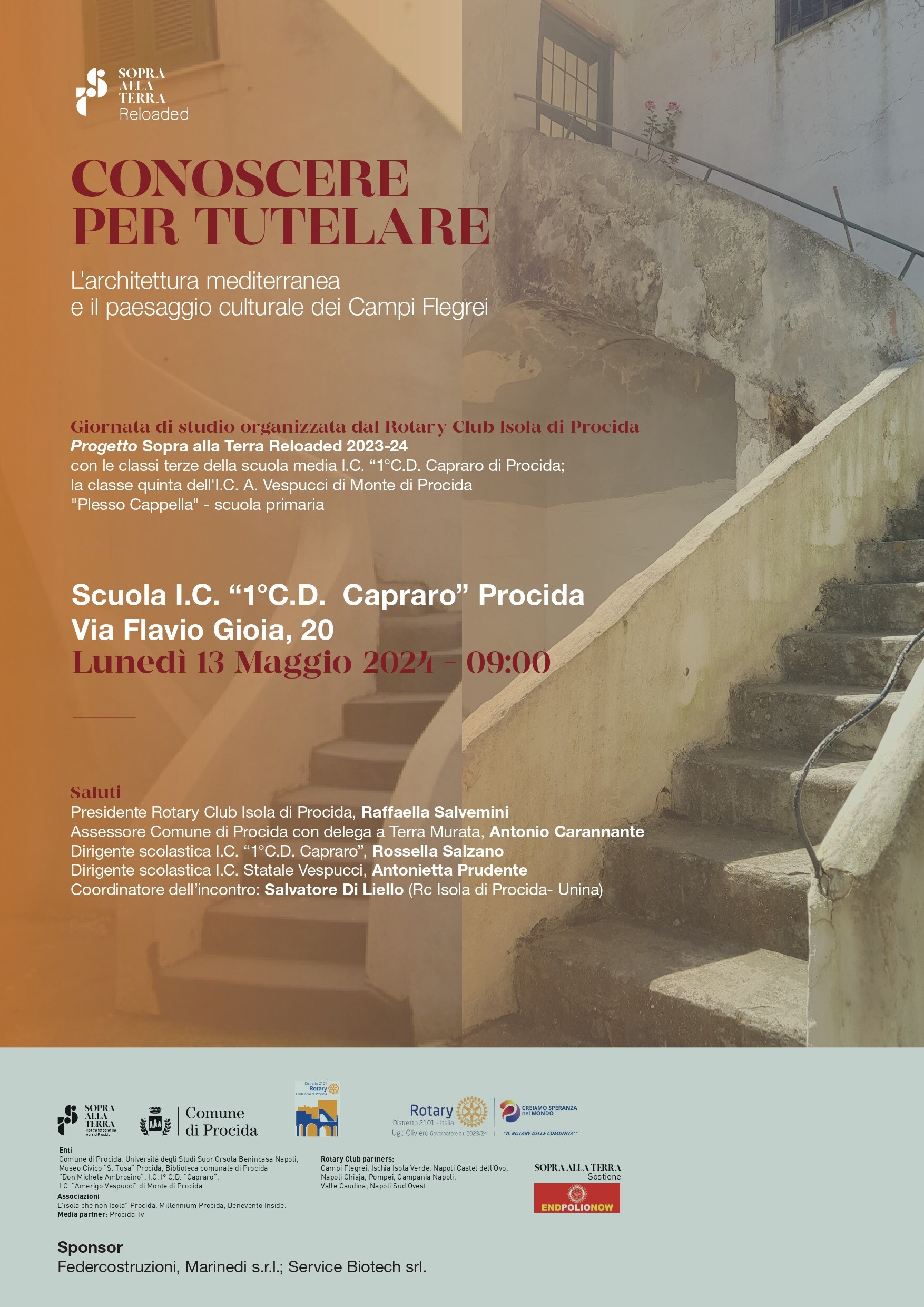 PROCIDA – Lunedì 13 maggio 2024 alle ore 9:00, presso il I° C.D. “Capraro” in via Flavio Gioia, con la partecipazione di Antonio Carannante, Assessore con delega a Terra Murata, Rossella Salzano, dirigente scolastico dell’ I° C.D. “Capraro”, Antonietta Prudente, dirigente scolastico ICS “Amerigo Vespucci” di Monte di Procida, coordinatore Salvatore Di Liello, Rc Isola di Procida- Unina, si terrà la giornata di studio organizzata dal Rotary Club isola di Procida sul tema “Conoscere per tutelare. L’architettura mediterranea e il paesaggio culturale dei Campi Flegrei” con la locandina dell’evento che mostra le foto di due scale, una a Procida e l’altra a Cappella (frazione del Comune di Monte di Procida), straordinariamente simili.