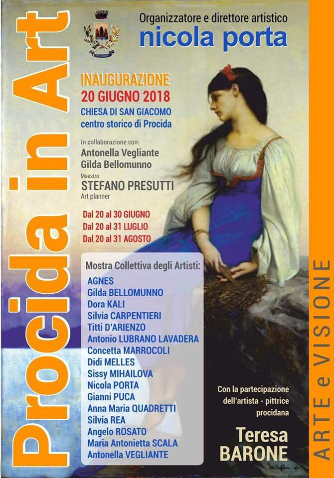 PROCIDA – “Procida in Art”, questo il titolo della mostra collettiva d’arte, organizzata e diretta da Nicola Porta, in collaborazione con Antonella Vegliante e Gilda Bellomunno, l’art planner maestro Stefano Presutti e con la partecipazione straordinaria della pittrice procidana Teresa Barone, che aprirà i battenti mercoledì 20 giugno alle ore 11,30 presso l’ex chiesa di San Giacomo. Sarà possibile visitare la mostra dal 20 al 30 giugno; dal 20 al 31 luglio; dal 20 al 31 agosto. L’ingresso è gratuito.