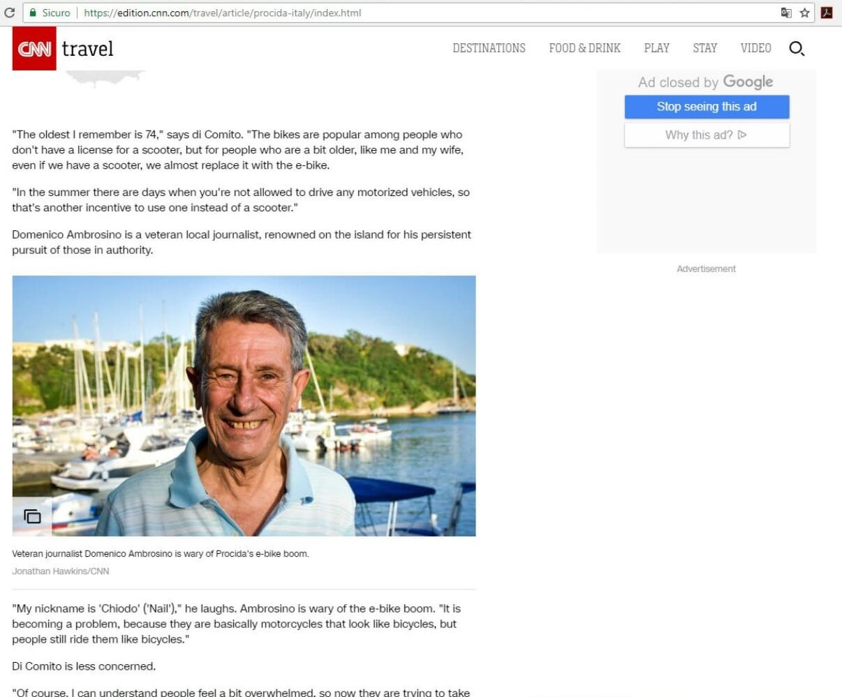 PROCIDA – Lo scorso mese di agosto, tra l’altro, si è caratterizzato per un bel servizio giornalistico pubblicato dalla nota testata americana CNN. A raccontarci un retroscena il decano dei giornalisti procidani Domenico Ambrosino: «Il mese passato è ritornato a Procida Michele Scotto D’Apollonia, un amico di gioventù, che non vedevo da 40 anni. E’ con la famiglia, la moglie messicana, la figlia, il genero, un vivacissimo nipote. Ci incontriamo alla Chiaiolella. Abbracci, baci, ricordi, scambi di esperienze. Il genero, una persona simpatica e cordiale, si chiama Jonathan Hawkins, giornalista, reporter, lavora con la CNN. Parliamo di Procida, della sua storia, del turismo, delle bici elettriche che lui ha notato e considera una piacevole, interessante novità. Ci confrontiamo sul problema, sul traffico, sulla mobilità, sull’impatto del turismo nell’isola, sulla Corricella che rischia di perdere la sua identità, sulle ragioni per cui Procida, al contrario di Ischia e Capri, è riuscita finora a non perdere la sua anima e che ora rischia. Insomma una bella chiacchierata. Che poi vedo riassunta in un reportage “mondiale” curato dalla CNN. Bene, grande soddisfazione: per la mia modesta persona (definito dal collega “the veteran local journalist”) e per la indubbia promozione dell’isola. Con un piccolo neo: il collega Pasquale Raicaldo, di “La Repubblica”, riprendendo il reportage omette completamente il mio nome e le mie considerazioni giornalistiche. Pazienza, forse non aveva spazio!».