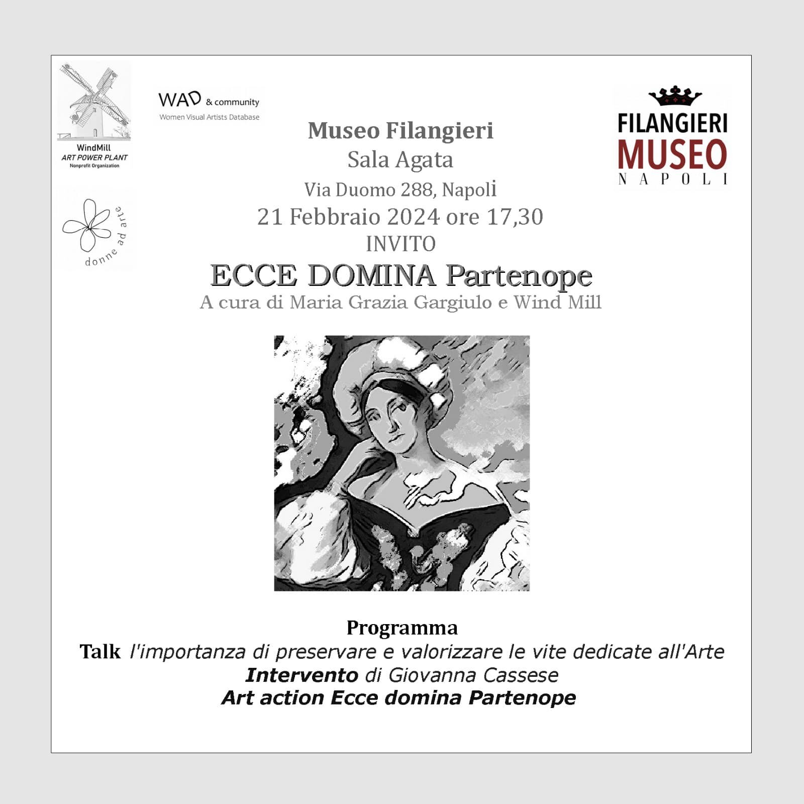 PROCIDA – Il 21 Febbraio 2024 alle ore 17,30, presso il Museo Civico Gaetano Filangieri di Napoli “Sala Agata”, si terrà l’evento culturale “Ecce Domina Partenopea”, Women Visual Artists Database, l’importanza di preservare e valorizzare le vite dedicate all’Arte curato da Maria Grazia Gargiulo e Laura VdB Facchini.