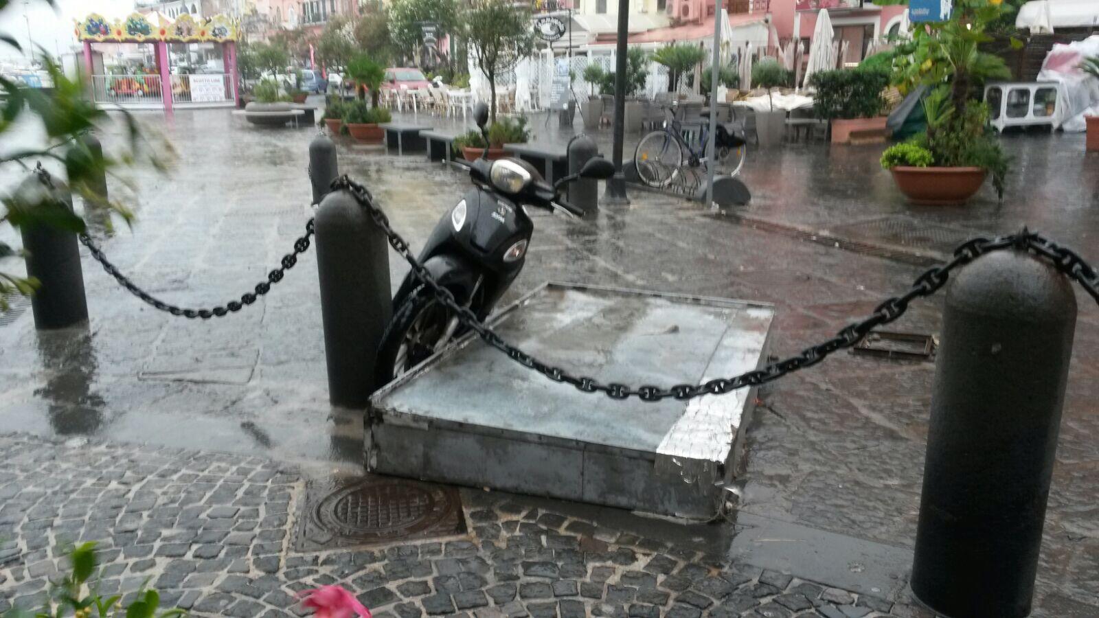 tempestaPROCIDA – Questa mattina verso le ore 9,15 un forte temporale si è abbattuto sull’isola di Procida. Lampi, tuoni ed una pioggia torrenziale ha provocato non poche preoccupazioni e disagi. Queste alcune foto di Piazza Marina Grande, completamente allagata, compreso la chiesa di SS. Maria della Pietà e San Giovanni Battista dove alcuni tombini sono saltati. Sul posto la Protezione Civile.