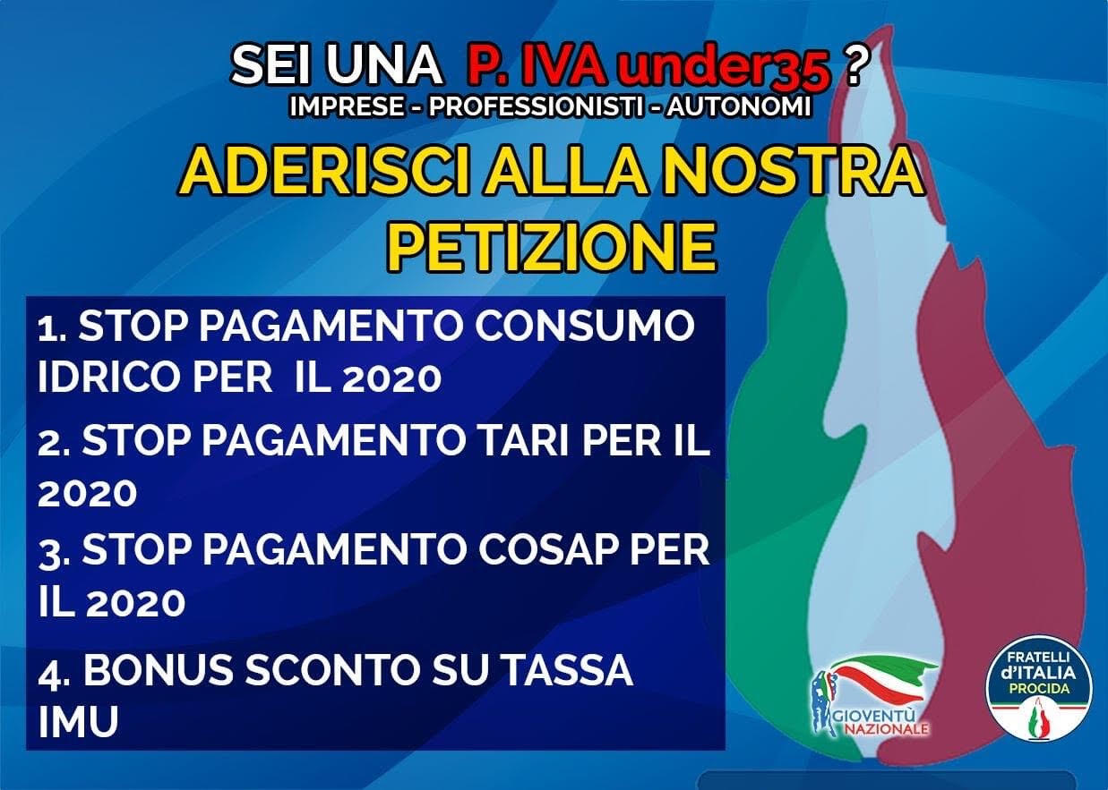 PROCIDA -I giovani di Fratelli d’Italia, nelle persone dei rappresentanti Maurizio Visobello e Michele Lubrano Lobianco, alla luce della mancate risposte dell’Amministrazione sulle proposte già formulate, lanciano un pubblica petizione per fare in modo che, per agevolare le partite IVA under 35 in grossa difficoltà, venga abolito il pagamento del consumo idrico SAP, della TARI, della COSAP e previsto uno sconto del 50%  sull’IMU.