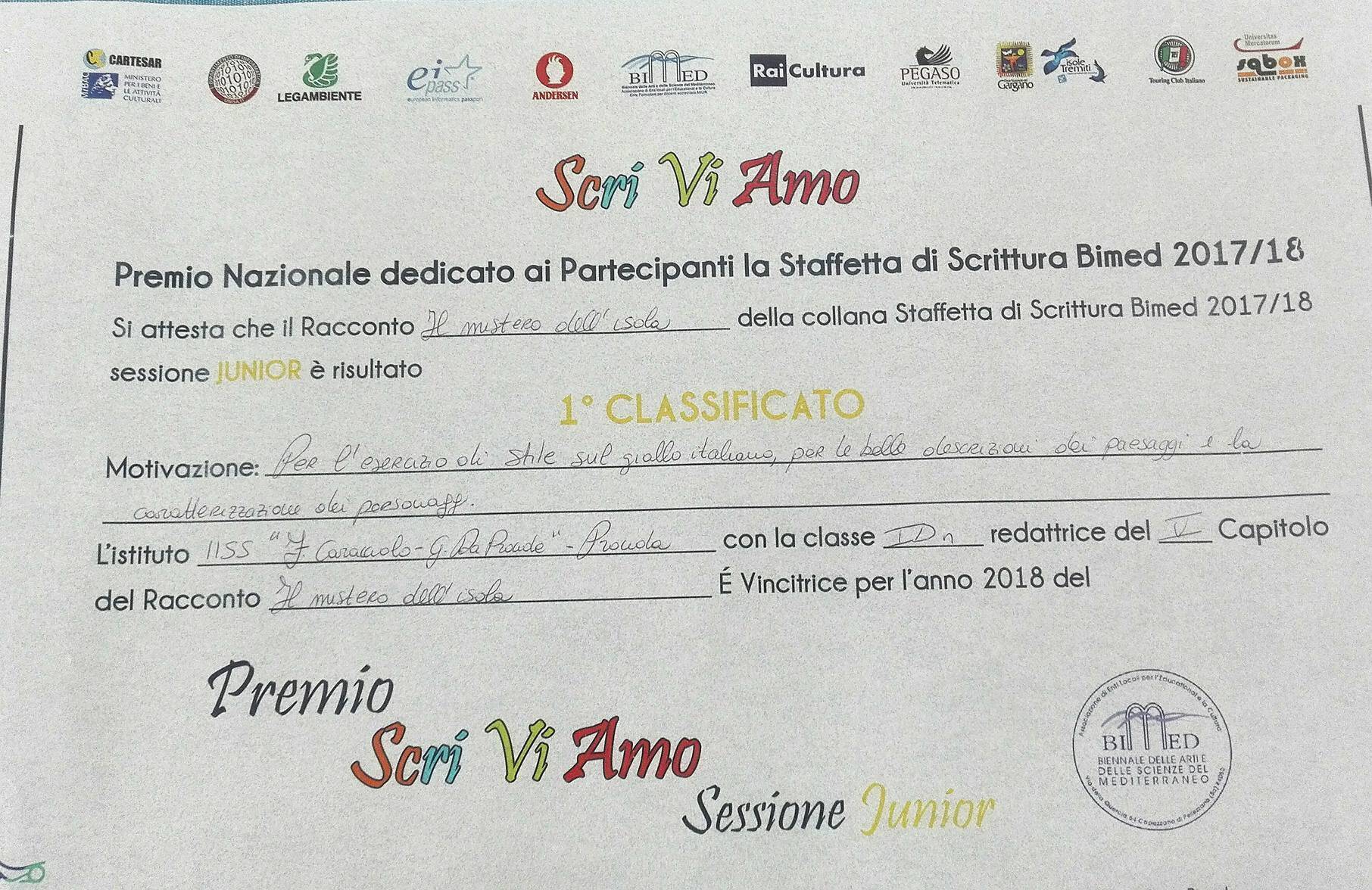 PROCIDA – Un nuovo riconoscimento per l’Istituto Superiore “F. Caracciolo – G. da Procida”. La I D dell’indirizzo tecnico nautico vince alla Staffetta di scrittura Bimed 2017/18 sessione Junior con il racconto “Il Mistero dell’isola”. Bravissimi gli studenti e congratulazioni alla loro Prof.ssa Francesca Borgogna.