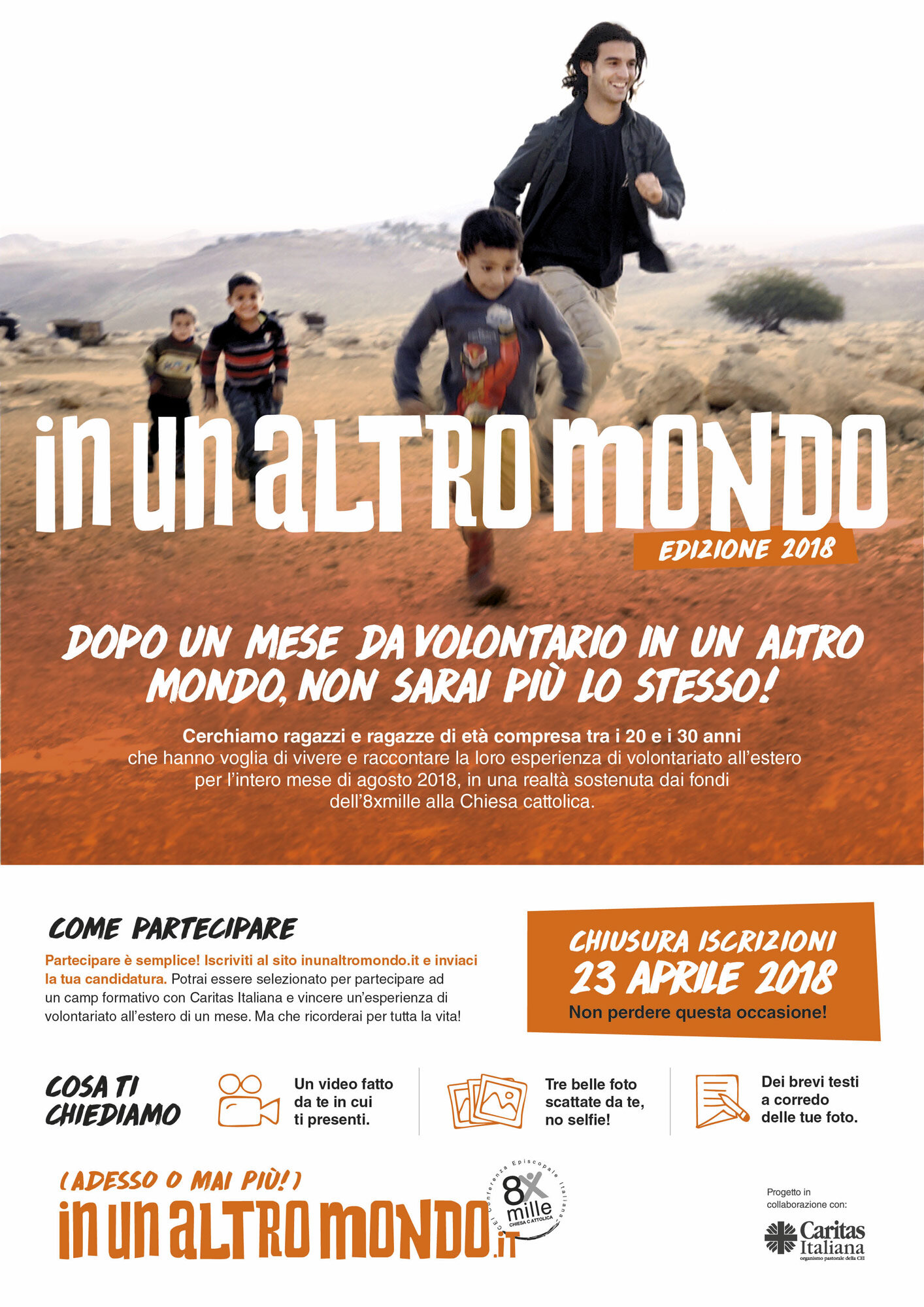 Ultimo giorno per iscriversi alla V edizione del contest In Un Altro Mondo. Rivolto a giovani dai 20 ai 30 anni, offre la possibilità di partecipare ad un progetto che mette in palio un mese di formazione umana al servizio degli ultimi, dei dimenticati, in quelle “periferie” del mondo sempre nel cuore di Papa Francesco.