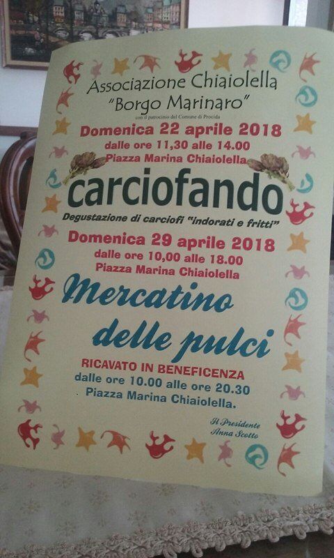 PROCIDA – L’Associazione Chiaiolella Borgo Marinaro, presieduta dalla sig.ra Anna Scotto, con il patrocinio del Comune di Procida, ha programmato due appuntamenti per questo mese di Aprile che si terranno nell’incantevole cornice del borgo di Marina Chiaiolella. Si inizia Domenica 22 Aprile dalle ore 11,30 alle 14,00 con “Carciofando” degustazioni di carciofi “indorati e fritti” e si prosegue Domenica 29 Aprile, dalle ore 10,00 alle ore 18,00, con il “Mercatino delle pulci”. Come per tutte le iniziative dell’Associazione, che oramai da anni opera sul territorio, il ricavato sarà devoluto in beneficenza. «Tradizione, sapori antichi e prodotti tipici – sottolinea l’assessore alla cultura ed eventi Nico Granito – saranno i protagonisti di una serie di eventi che l’Associazione Borgo Marinaro di Chiaiolella organizzerà tra la primavera e l’estate. Il buon cibo e la valorizzazione del suggestivo borgo di Chiaiolella la mission dell’Associazione che, dopo il successo del Procida Food Contest dello scorso anno, oltre agli appuntamenti già fissati per Aprile organizzerà altri momenti di incontro per il 20 maggio con “limonando” specialità al limone e il 3 giugno ” friggendo…mangiando”, fritture di pasta cresciuta con prodotti dell’orto. Ringrazio – conclude l’assessore Granito – la presidente e tutte le socie dell’Associazione per il lavoro volontario che portano avanti teso a rivalutare i prodotti tipici della nostra terra ed alla solidarietà che è il fine principale di tutto».
