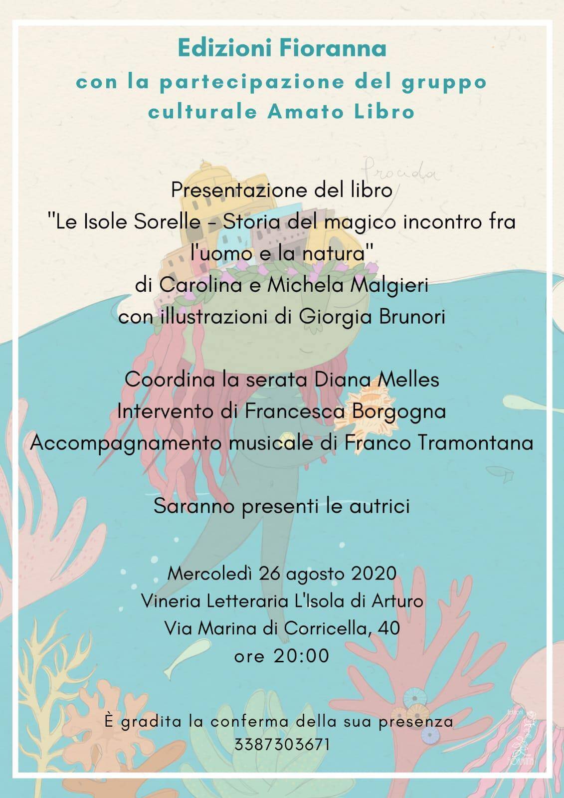 PROCIDA – Mercoledì 26 agosto alle ore 20,00 presso la Vineria Letteraria Isola di Arturo, nel borgo dei pescatori a Marina Corricella 40, la casa editrice Edizioni Fioranna con la partecipazione del gruppo culturale Amato Libri presentano il libro: “Le isole sorelle – Storia del magico incontro fra l’uomo e la natura” scritto da Carolina e Michela Malgieri con illustrazioni di Giorgia Brunoni. Con la presenza delle autrici, coordina la serata Diana Melles, intervento di Francesca Borgogna, accompagnamento musicale di Franco Tramontana. E’ gradita la conferma della presenza al numero di telefono 3387303671.