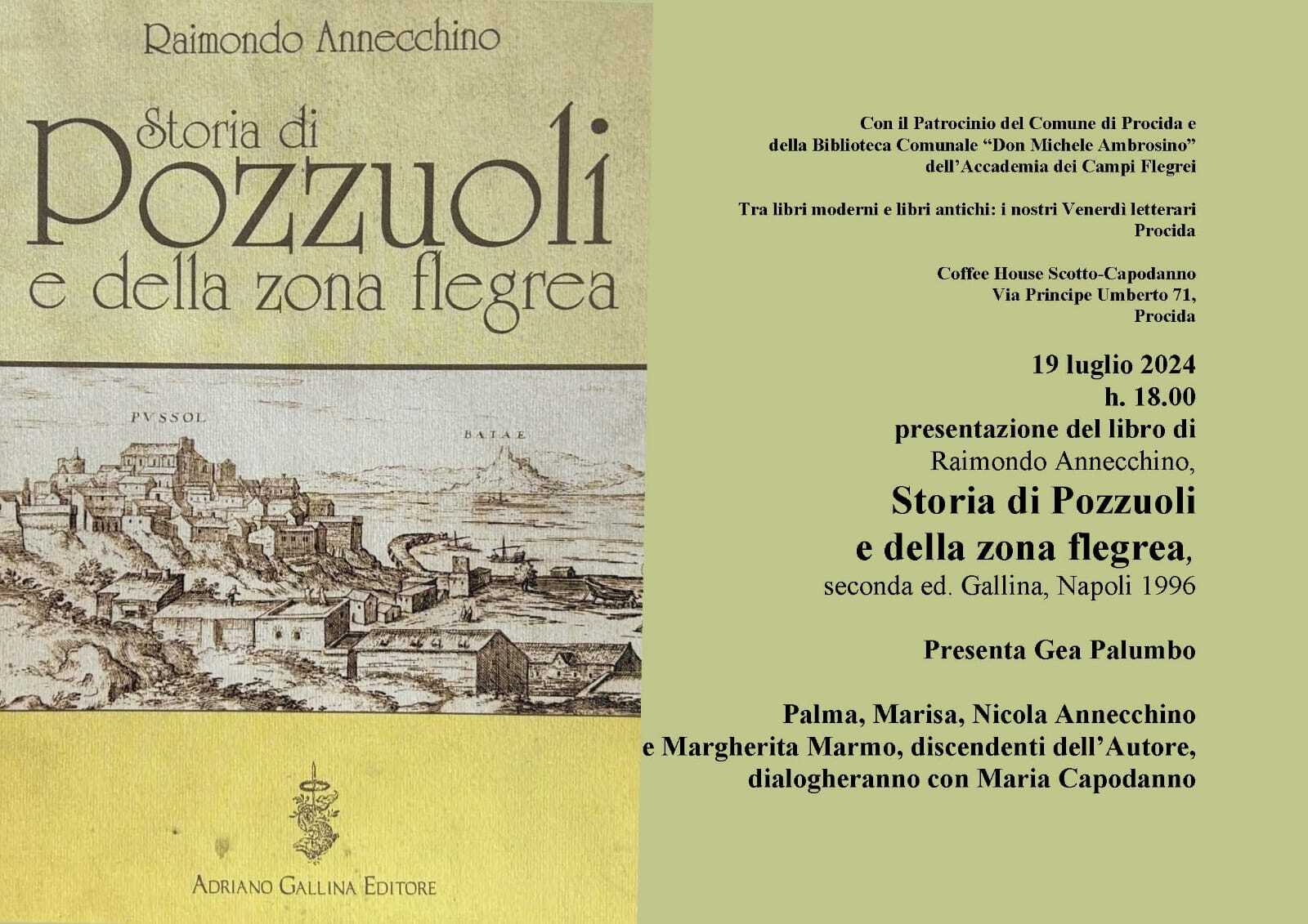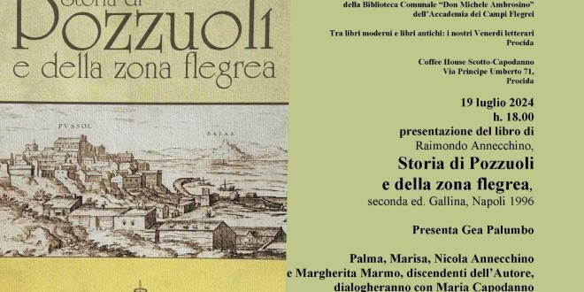 PROCIDA – Venerdì 19 Luglio alle ore 18,00 presso la coffee house Scotto- Capodanno in Via principe Umberto, 71, con il patrocinio del Comune di Procida, della Biblioteca Comunale “Don Michele Ambrosino” e dell’Accademia dei Campi Flegrei, presentazione del libro di Raimondo Annecchino “Storia di Pozzuoli e della zona flegrea” seconda ed. Gallina, Napoli 1996. Palma, Marisa, Nicola Annecchino e Margherita Marmo, discenti dell’autore, dialogheranno con Maria Capodanno. Presenta Gea Palumbo.