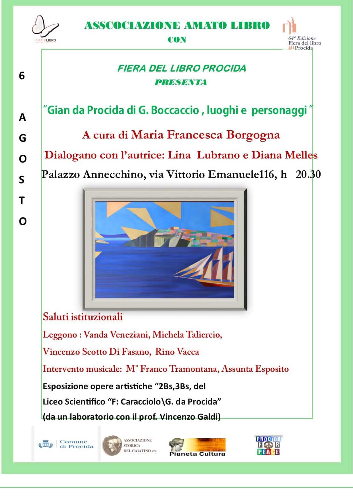 PROCIDA – L’Associazione Amato libro, in collaborazione con la Fiera del libro di Procida, quest’anno giunta alla 64° edizione, presso Palazzo Annecchino, in via Vittorio Emanuele116, martedì 6 Luglio alle ore 20.30, presenta il saggio “Gian da Procida di G. Boccaccio, luoghi e personaggi”, curato della prof.ssa Maria Francesca Borgogna con un lavoro che intende recuperare un frammento della storia di Procida in un importante contesto letterario.