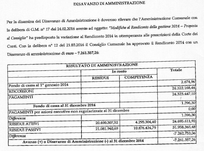 Il Pignoramento dei conti correnti tenuti dal Comune di Procida presso Poste Italiane a seguito di una vertenza con creditori è contro legge ed in virtù di ciò si invita ad agire per legittimare quanto di illecito è stato fatto, e non di pensare solamente a come creare disinformazione. Quanto alla “debitoria” che sostiene essere di ben 32Milioni di euro, per smascherare l’inganno proponiamo in foto un documento ufficiale agli atti del Comune di Procida opportuno per andare ad analizzare il reale disavanzo accertato al 31/12/2014 è di circa di 7,2 milioni: a fronte dei 31,9 impegni da pagare ( quelli citati da Villani) vi sono 24,6 crediti da incassare che Villani ha dimenticato volutamente di citare. La nuova contabilità dal 1 gennaio 2015 impone poi un accantonamento prudenziale (che non é un debito) molto elevato come quota di possibile svalutazione dei crediti. Incassando i crediti quell’importo si riduce automaticamente. In ogni caso la cifra citata da Villani é un numero a fantasia.