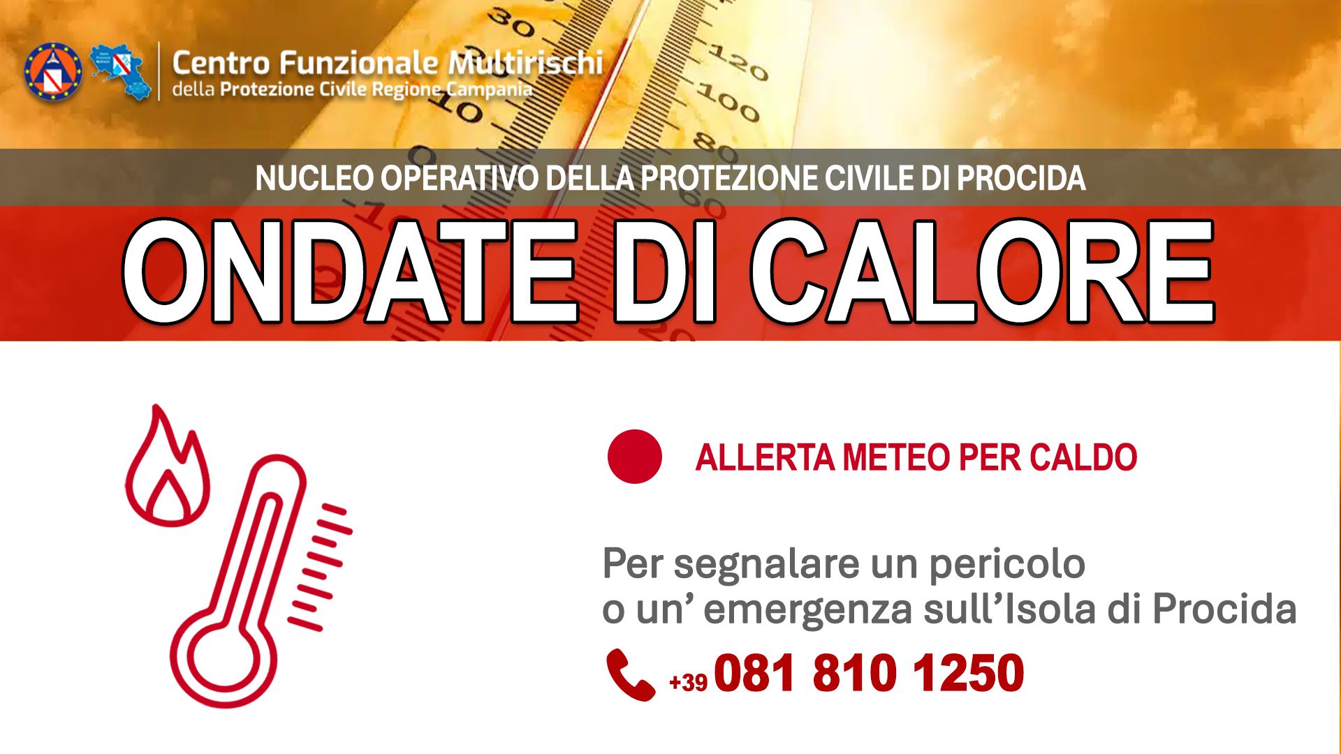 PROCIDA -Il Centro Funzionale della Protezione Civile della Regione Campania, in considerazione del quadro meteo in atto, ha emanato un avviso di criticità per “Ondate di calore” valido dalle 8 di domani mattina alle 14 di lunedì 30 giugno.Si prevedono temperature che potranno essere superiori ai valori medi stagionali di 6-7°C e saranno associate ad un tasso di umidità che, soprattutto nelle ore serali e notturne sul settore costiero, potrà superare anche il 50-60%.