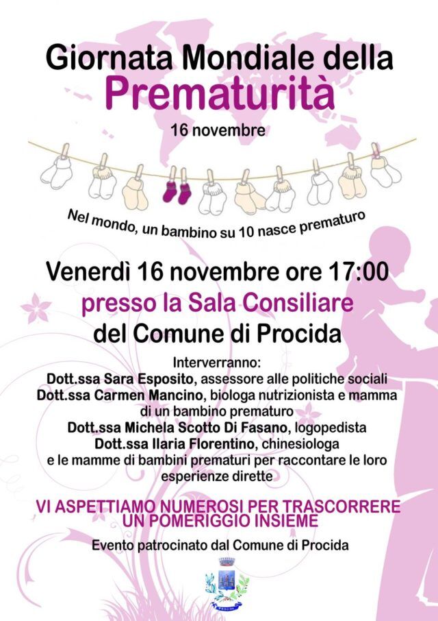 PROCIDA – L’Amministrazione Comunale, nella persona dell’Assessore alle Politiche Sociali Sara Esposito, intende accogliere e condividere l’iniziativa che si terrà venerdì 16 novembre in occasione della Giornata Mondiale dei Prematuri. Già in passato questa amministrazione si è mostrata sensibile ed attenta a questo tipo di iniziative e ad eventi ad essa correlati. Oggi nel mondo un bambino su dieci nasce prematuro. In Italia ogni anno si celebra la Giornata Mondiale dei Prematuri evento riconosciuto anche dal Parlamento Europeo. La proposta è stata presentata dalla dott.ssa Carmen Mancino e si terrà presso la sala consiliare.