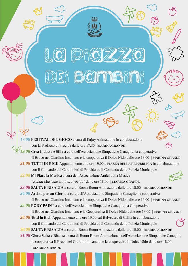 PROCIDA – (c.s.) Da un’idea della Consigliera Sara Esposito, l’Assessore Rossella Lauro e l’Assessore Nico Granito dal 17 al 31 agosto verranno promosse delle iniziative per i più piccoli grazie alla partecipazione di Enjoy Animazione, la ProLoco, l’Associazione Simpatiche Canaglie, la cooperativa Il Bruco del Giardino Incantato, la cooperativa Il Dolce Nico, l’associazione Amici della Musica “Banda Musicale Città di Procida”, Boom Boom Animazione.Il programma: