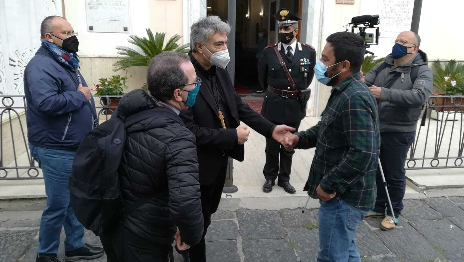 PROCIDA – L’arcivescovo di Napoli Domenico Battaglia è sbarcato, questa prima domenica di maggio, a Procida per celebrare una Messa nel Santuario di San Giuseppe a Chiaiolella in occasione di San Giuseppe Lavoratore. All’esterno dello stesso Monsignor Battaglia, accompagnato da don Lello Ponticelli, (foto di ProcidaTV) ha incontrato Nicola Ambrosino, figlio del proprietario della casa abbattuta qualche giorno fa che sorgeva in un vicoletto a poca distanza. L’arcivescovo ha espresso la sua vicinanza alla famiglia Ambrosino, mentre Nicola ha chiesto a Battaglia di farsi portavoce del dramma delle famiglie della Campania (circa 70.000) alle prese con sentenze di abbattimento di immobili non in regola con le normative edilizie.