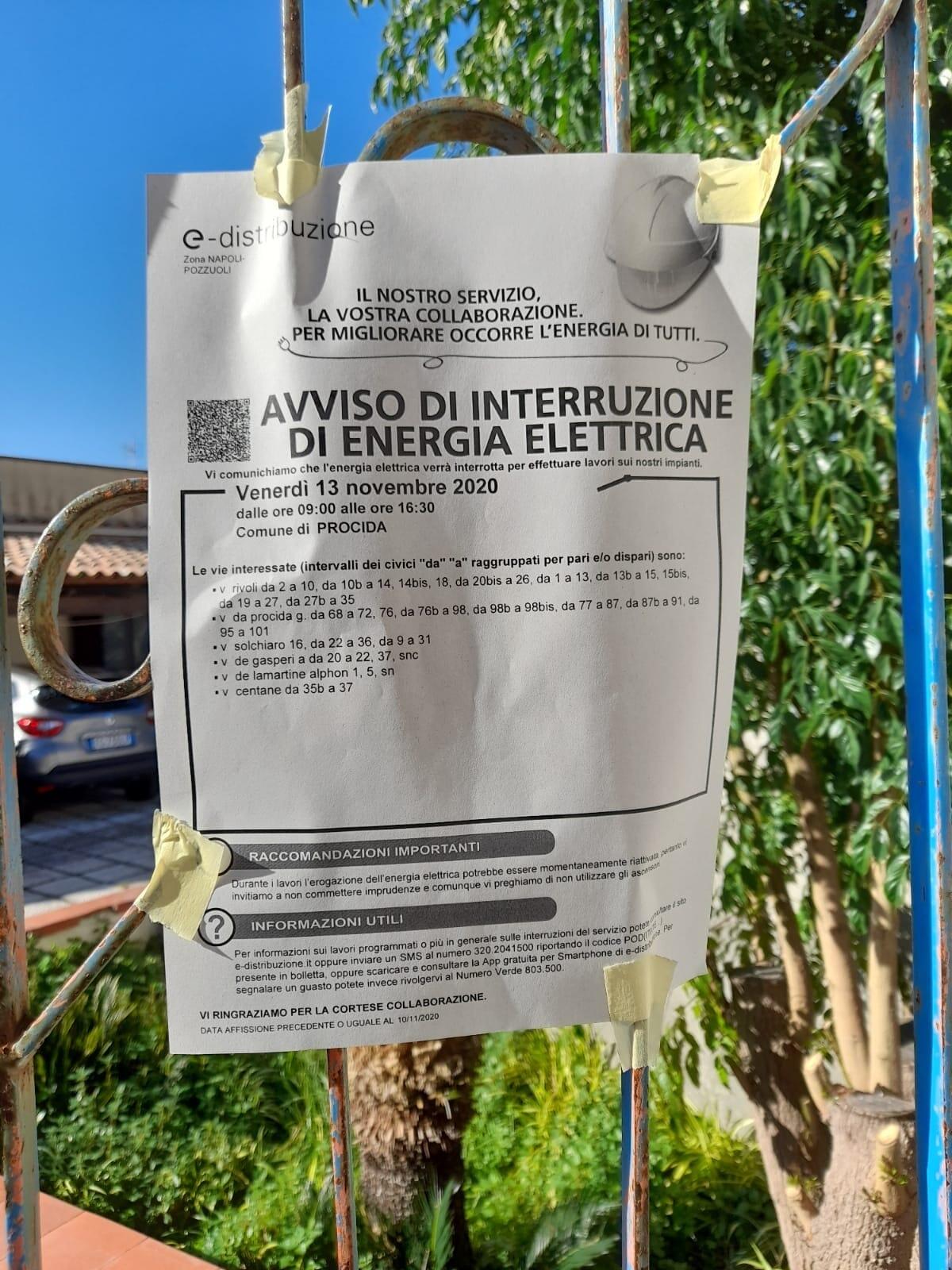PROCIDA – Così come comunicato dalla Dirigente scolastica dott.ssa Rossella Salzano sul sito web dell’Istituto Comprensivo “A. Capraro”, il 13 novembre dalle ore 9,00 alle ore 16,30: “A causa di lavori in corso sulla rete di alimentazione dell’energia elettrica, in alcune zone del Comune di Procida sarà sospesa l’erogazione; ciò naturalmente potrebbe rendere impossibile sia per gli alunni che per i docenti la fruizione delle lezioni previste per quel giorno. Nella speranza che ciò possa determinare meno disagio possibile si comunica che per gli alunni l’assenza sarà giustificata per cause di forza maggiore”.