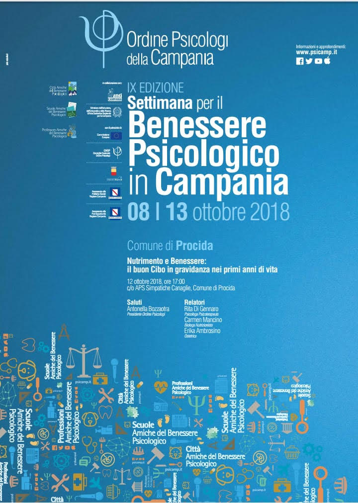 PROCIDA – Giunta alla sua IX edizione, l’Ordine degli psicologi della Campania propone la settimana del Benessere Psicologico in Campania dall’8 al 13 ottobre. Anche Procida ha dato la propria adesione organizzando un momento di riflessione sul tema “Nutrimento e Benessere: il buon cibo in gravidanza nei primi anni di vita” che si terrà venerdì 12 ottobre alle ore 17.00 presso l’Aps Simpatiche Canaglie. Parteciperanno all’iniziativa: il presidente dell’Ordine degli Psicologi Antonella Bozzaotre, psicoterapeuta Rita di Gennaro, la nutrizionista Carmen Mancino e l’ostetrica Erika Ambrosino.