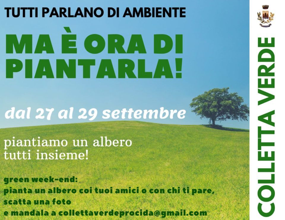 PROCIDA – L’Assessore Titta Lubrano, con delega all’Ambiente, ha condiviso un’iniziativa: “Con la Delibera di Giunta Comunale n. 141/2019 abbiamo approvato e lanciamo dall’isola di Procida una campagna di sensibilizzazione ambientale e piantumazione di alberi autoctoni denominata “Colletta Verde” nel periodo 27-29 settembre 2019.