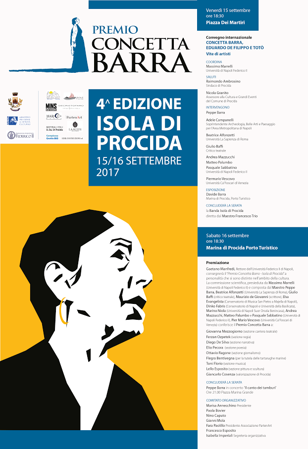 La serata del Premio è preceduta da un convegno internazionale sul tema “ Concetta Barra, Eduardo de Filippo e Totò” che si terrà venerdì 15 settembre 2017 ore 18,30 in piazza dei Martiri dove porteranno i saluti di Procida il Sindaco Raimondo Ambrosino e l’assessore alla CulturaNicola Granito.