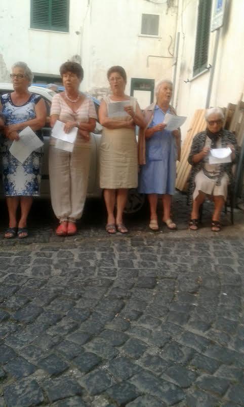 Iniziava come voce solista qualcuna di loro, non ricordi bene chi, (ne è passato di tempo!) forse Luciella la Pannara, Lenuccia Tagliamonte, chissà! Quello che è certo che man mano si accodavano con evidenti stonature Maria Arcangiuliello e Concetta ‘ a Rocca, Celeste e Maria Pietà, Marietta e Luciella Scallone, Sisina Bellupadrone e Teresina di Stefano. Assuntina Bonommo e Maria Mundino, Lucia e Sabetta Corecane, Teodolinda Spasiello e Assuntina la Petecara, Ntunuttina Pelillo e Maria ‘u signore, Rosa e Nannina Piettorusso, Sisina Barone e Titina Federico e poi… e poi sei costretto a fermarti, perché rivangando nella memoria tutte le evanescenti figure, che popolavano allora via Vacca, la Varra, le Centane e Solchiaro, ti prende un groppo alla gola, pensando che di quelle donne solo pochissime sopravvivono ancora.
