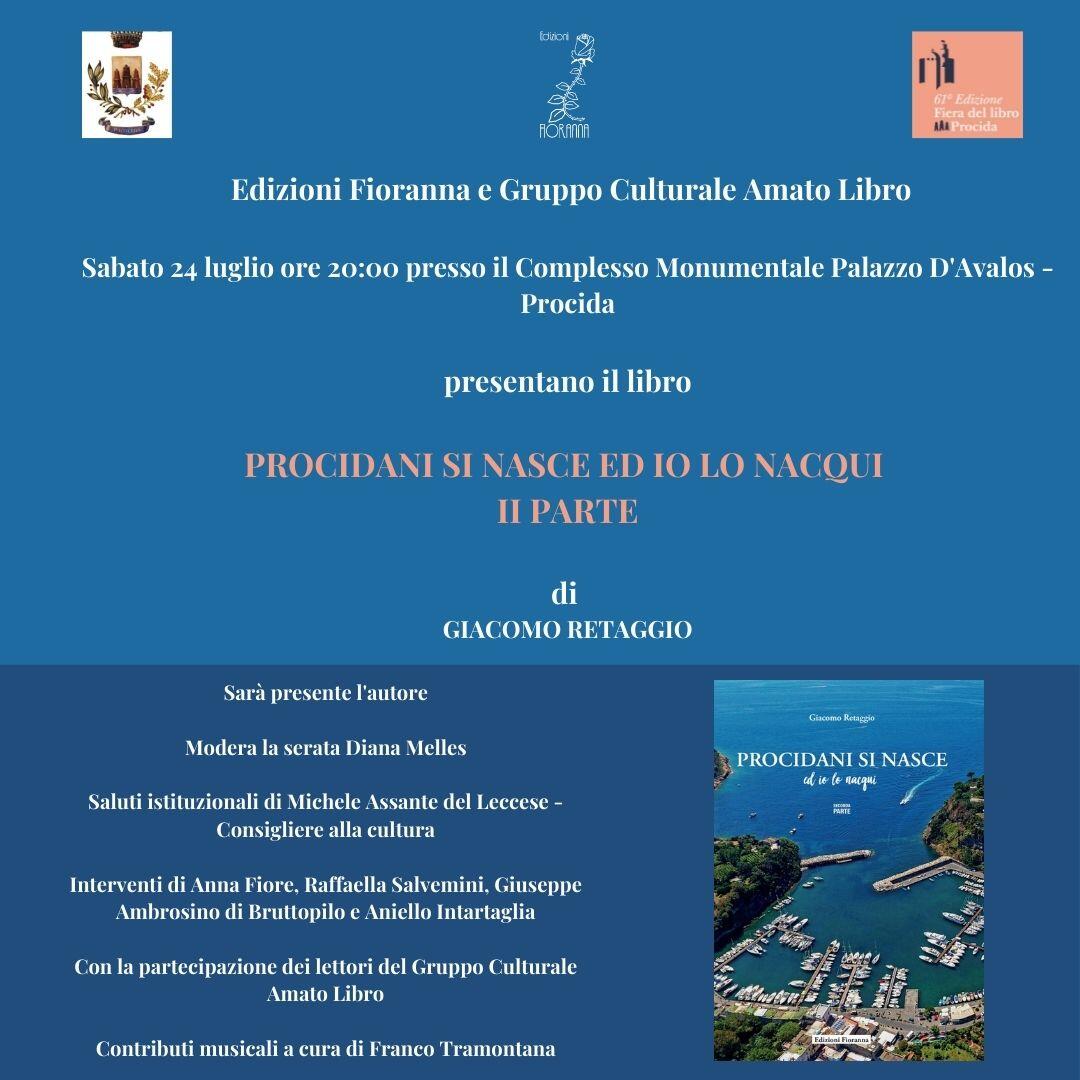 PROCIDA – Appuntamento da non perdere. Sabato 24 luglio alle ore 20,00 presso il complesso monumantale Palazzo D’Avalos, Edizioni Fioranna e Gruppo Culturale Amato Libro, presentano il libro di Giacomo Retaggio “Procidani si nasce ed io lo nacqui – II Parte”.