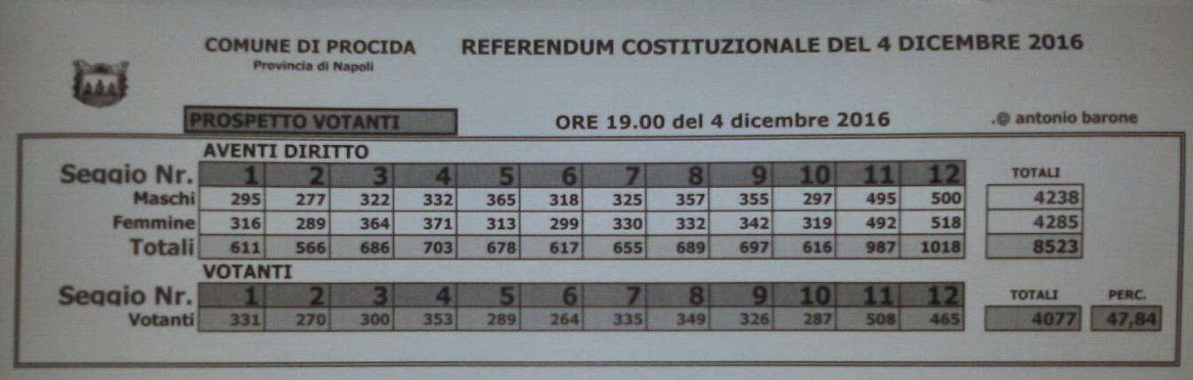 Alle 19 nel Comune di Procida hanno votato il 47,84% per un totale di 4077 votanti. Per i dettagli cliccare sull’immagine.