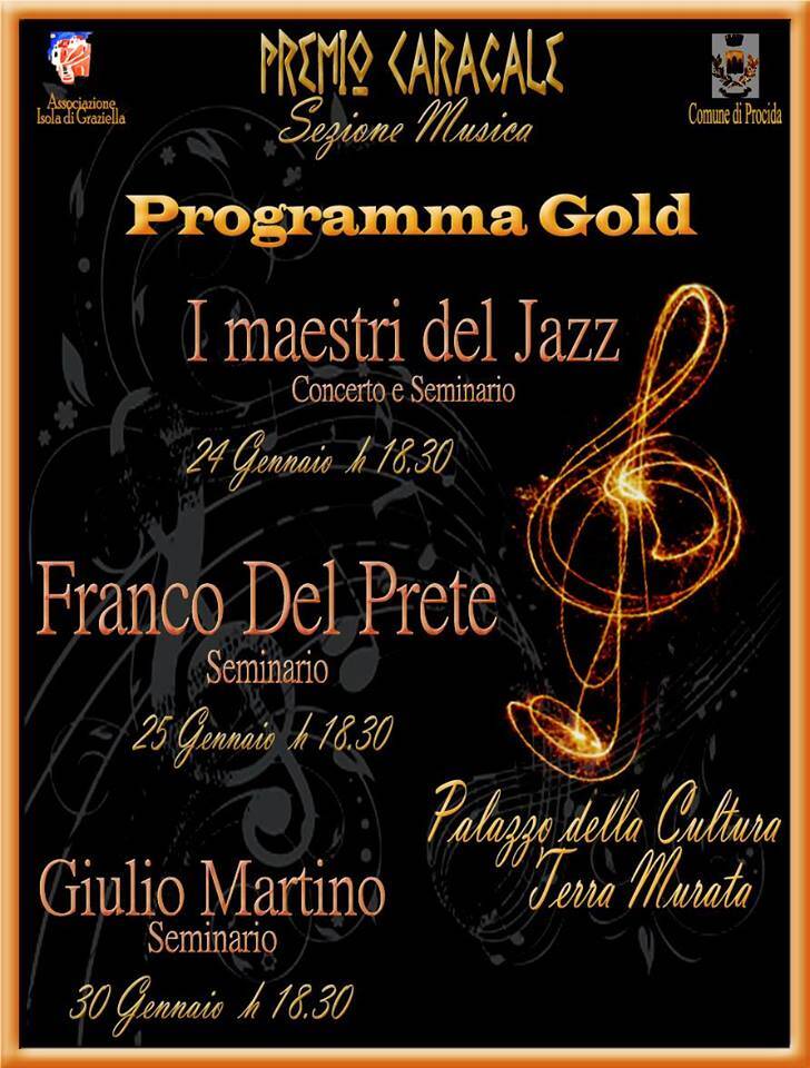 (c.s.) L’associazione culturale «Isola di Graziella» è lieta di presentare il terzo appuntamento “didattico” del Premio Caracalè – Procida Art Contest 2014-2015: la Sezione Musica. Con questo appuntamento, l’associazione vuole offrire a coloro che si iscriveranno sia la possibilità di conoscere alcuni musicisti professionisti, sia di poter esprimere il loro potenziale e la loro creatività a contatto con veterani del settore. Interverrà il gruppo “I Maestri del Jazz”, composto da Carlo Lomanto (cantante), Lorenzo Federici (trombettista), Giancarlo Giangrande (contrabbassista) e Mimmo Napolitano (pianista), tutti maestri di conservatorio; Franco Del Prete, leggendario batterista e compositore di gruppi come Napoli Centrale e Sud Express e il grande sassofonista Giulio Martino.
