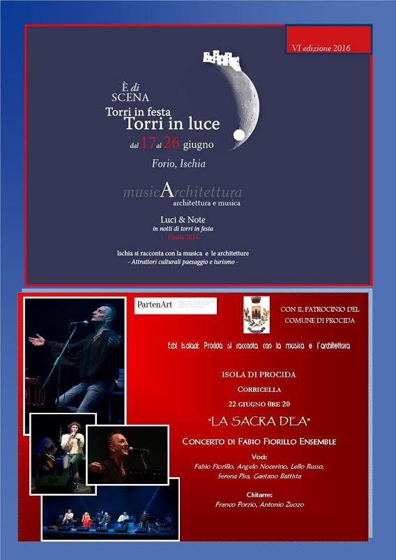 PROCIDA – (c.s.) Quest’anno Procida sarà ospite d’onore nell’ambito della sesta edizione di “Torri in Festa”, l’iniziativa ideata dall’architetto Aldo Imer in collaborazione con il Comune di Forio e il Ministero dei Beni Culturali. Mercoledì 22 giugno alle 20 Marina Corricella farà da sfondo al concerto “La Sacra Dea“ del Fabio Fiorillo Ensemble, con le voci di Angelo Nocerino, Lello Russo, Serena Pisa, Gaetano Battista, oltre allo stesso Fiorillo e le chitarre di Angelo Zurzo e Franco Porzio. L’evento è patrocinato dal Comune di Procida.